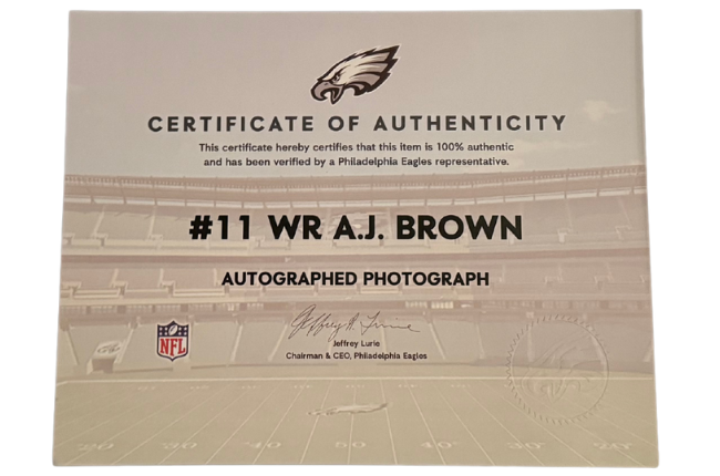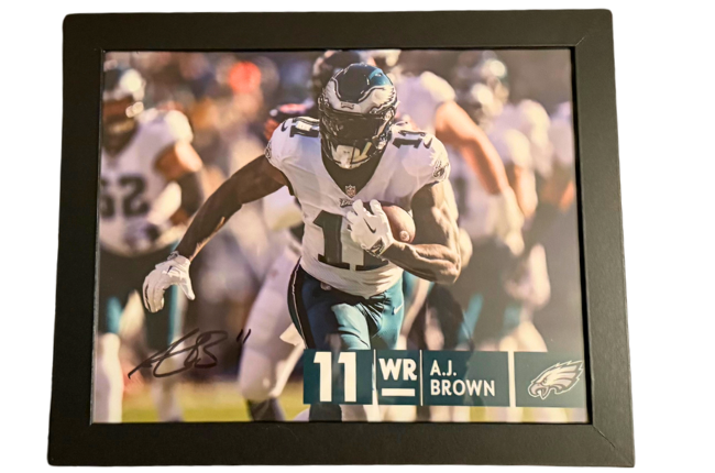 You are bidding on an autographed photograph of Philadelphia Eagle's star wide receiver, A.J. Brown. The photograph measures 11" x 8 1/2" and is in a plain back frame. This photograph comes with a Certificate of Authenticity directly from the Philadelphia Eagles.