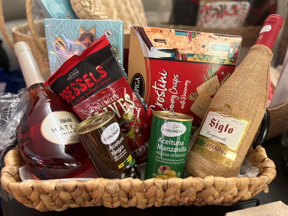 A Spanish wine basket with two bottles of wine, olives, crisps and chocolate. $125 value